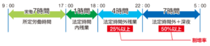 この場合、18時から22時までが25%以上、22時から翌日5時までが50%(時間外25%+深夜25%)以上の割増率で割増賃金が発生します。また、1カ月の時間外労働が60時間を超えるときは、割増率がそれぞれ50%以上、75%(時間外50%+深夜25%)以上となります。