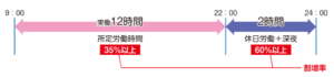 この場合、22時までが35%以上、22時以降が60%(時間外35%+深夜25%)以上の割増率で割増賃金が発生します。なお、法定休日に時間外労働をさせても別途時間外手当を支払う必要はありません。まとめると図2のようになります。