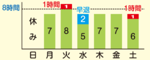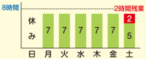 <ケース> 所定労働時間が1日7時間、週6日間勤務。火曜日に1時間残業、水曜日に2時間早退した場合